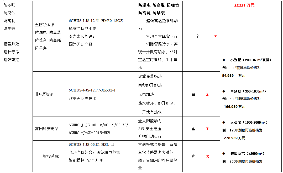 包括蓄熱式【八防三超太未鍋爐】 臺, 噸蓄熱水箱 個,升蓄熱調節水箱 個,即熱絕熱包 個,恒溫閥 個,24V離網安綠 W電站 個,24V直流安綠泵 個,無鉛極微鉛管閥龍頭 個,軟水設備 套,大數據智控系統 套,