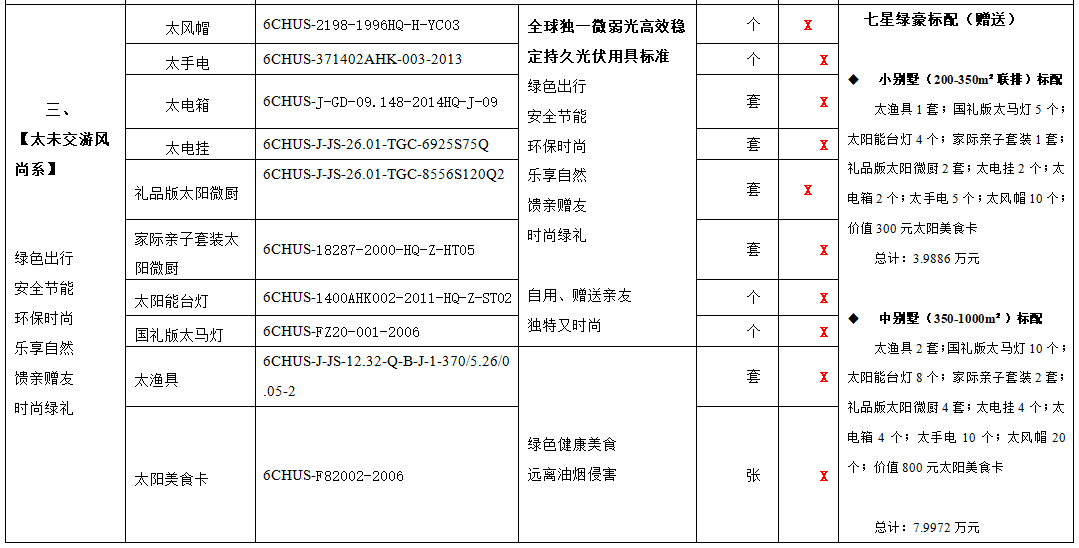 包括【六凈安綠標準6CHUS:---】—太風帽 個,太手電 個,太電寶 個,太電箱 個,太電掛 個,手提太陽微廚 個,太漁具 個。